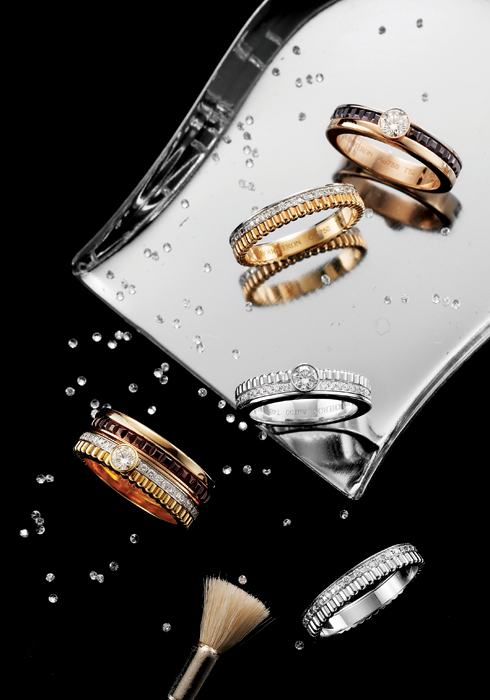 고유한 쿼트르 모티브에 다이아몬드를 솔리테어로 세팅해 여성스럽게 완성한 링. 남성은 심플한 밴드 링으로, 여성은 다이아몬드를 세팅한 디자인으로 선택하면 완벽하다. 모두 부쉐론.