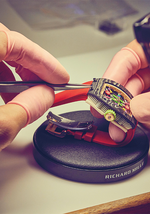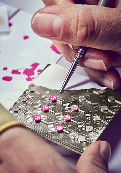 1 RM07-03 오토매틱 리치 워치의 최종 조립 과정. 2 시계 다이얼을 장식할 롤리팝 모티브의 미니어처 장식에 수작업으로 컬러를 입히고 있다. 3 RM37-01 오토매틱 키위 워치의 제작 과정. 4 최종 조립을 앞두고 있는 RM37-01 오토매틱 키위 워치. 완성된 형태의 케이스와 그린 컬러 러버 스트랩, 폴딩 형태의 버클, 작은 스크루 등을 볼 수 있다.