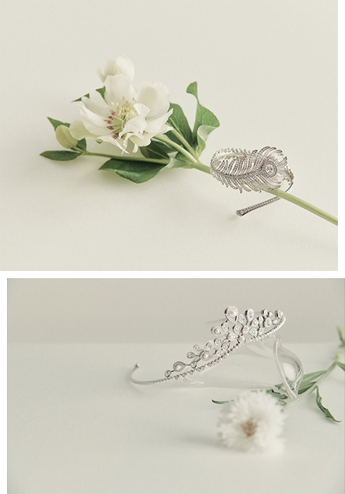 (위) 1개의 로즈 컷 다이아몬드와 7백45개의 라운드 컷 다이아몬드를 세팅한 플륌 드 펑 화이트 골드 브레이슬릿 가격 미정 부쉐론. (아래) 38개의 아코야 진주, 1백67개의 브릴리언트 컷 다이아몬드로 장식한 기품 넘치는 디자인의 조세핀 아그레뜨 임페리얼 디아뎀 가격 미정 쇼메. |