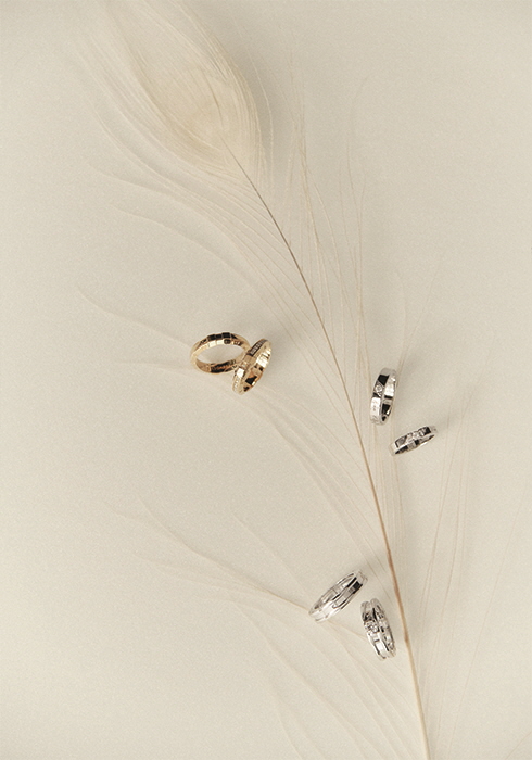 (위부터) 타임리스한 아름다움을 강조한 컨스텔레이션 웨딩 밴드. 남성을 위한 심플한 디자인의 컨스텔레이션 옐로 골드 링 1백75만원, 여성을 위한 다이아몬드 세팅 컨스텔레이션 옐로 골드 링 3백70만원 모두 오메가. 두께 4mm의 플래티넘 보디에 ‘Van Cleef & Arpels’ 문구를 인그레이빙하고 라운드 컷 다이아몬드를 세팅한 뚜쥬르 시그니처 에또왈 웨딩 밴드, 두께 3mm의 뚜쥬르 시그니처 에또왈 웨딩 밴드 모두 3백만원대 반클리프 아펠. 불가리를 대표하는 아이콘이자 베스트셀러인 비제로원 컬렉션의 웨딩 밴드. 모던한 디자인의 화이트 골드 비제로원 링 1백만원대, 브릴리언트 컷 다이아몬드를 센터 스톤으로 세팅한 화이트 골드 비제로원 링 가격 미정 모두 불가리.