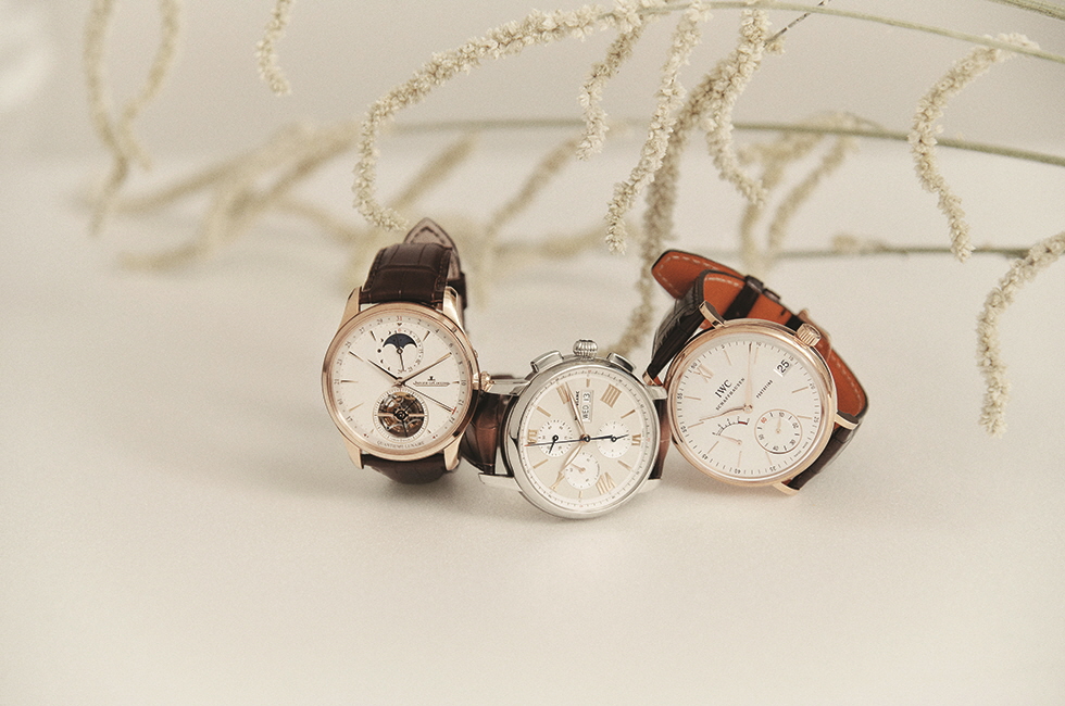 (왼쪽부터) 케이스 지름 41.5mm, 화이트 다이얼 위 문페이즈 디스플레이와 투르비용이 대칭을 이루는 마스터 울트라 씬 투르비옹 문 워치 가격 미정 예거 르쿨트르. 큼직한 로마숫자 인덱스와 크로노그래프 창을 갖춘 클래식한 다이얼의 스타 레거시 크로노그래프 데이 & 데이트 워치 6백15만원 몽블랑. 8일간의 파워 리저브 기능을 갖춘 칼리버 59210으로 구동하는 포르토피노 핸드 와인드 8 데이즈 워치. 레드 골드 케이스와 다크 브라운 앨리게이터 레더 스트랩이 어우러진 말쑥한 외관이 돋보인다. 2천3백40만원 IWC.