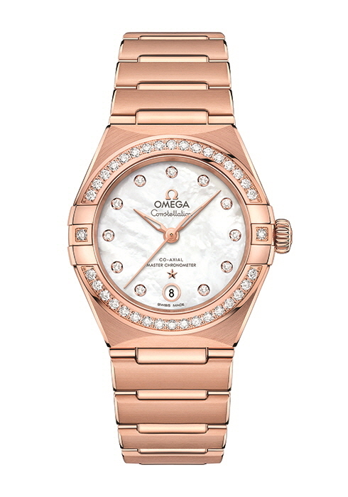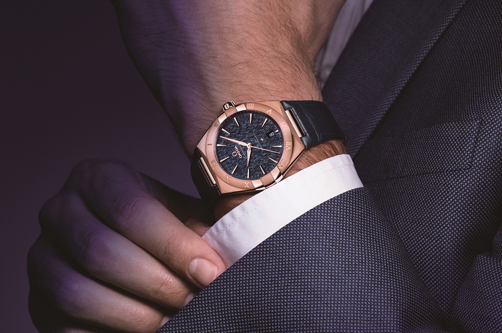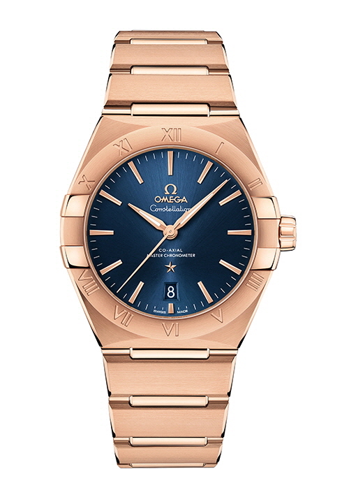 오메가 코-액시얼 마스터 크로노미터 39MM. 8 유백색 다이얼, 세드나 골드™ 케이스로 심플하고 클래식한 무드를 연출한 컨스텔레이션 워치.