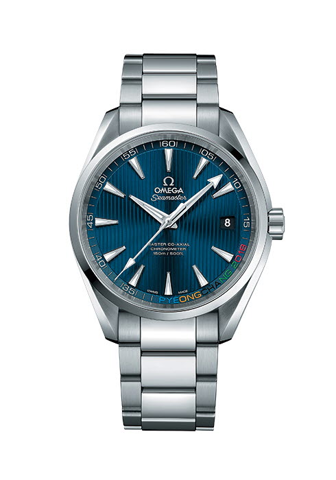 5 ‘오메가 씨마스터 아쿠아 테라 평창 2018’ 리미티드 에디션. ‘평창 2018’ 리미티드 에디션은 스테인리스 스틸 제품으로 블루 다이얼 미닛 트랙 위에 오륜기의 다섯 가지 상징적 컬러를 사용해 ‘PyeongChang 2018’이라는 문구를 새겨 넣었다.