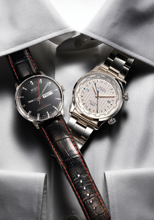(왼쪽) 미도 커멘더 II COSC 칼리버 80 스테디셀러 라인으로 초기 디자인을 유지하고 있는 레드 컬러 포인트의 클래식 워치. 80시간 파워 리저브 무브먼트를 탑재했다. 매년 스위스에서 제조하는 워치 중 단 5%만이 통과하는 엄격한 COSC 인증을 받았다. 1백 52만원.