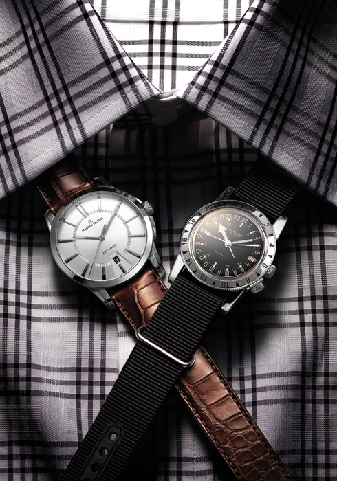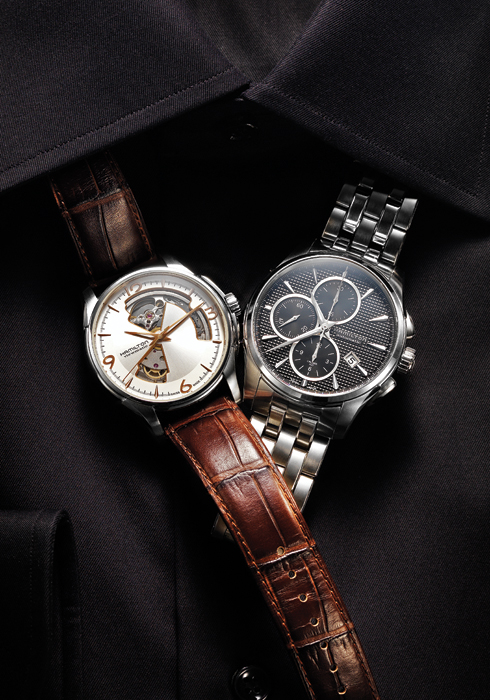 (왼쪽) 해밀턴 재즈마스터 오토 크로노 시, 분, 초, 날짜는 물론 타임키핑, 크로노그래프 기능까지 갖춘 기계식 시계를 원하는 남자들을 위한 완벽한 워치. 42mm 케이스에 H-21 무브먼트를 장착했으며 60시간 파워 리저브 기능도 갖췄다. 2백25만원.
