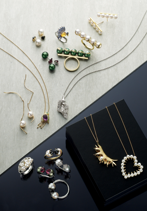 하트 모양으로 세팅한 담수 진주에 옐로 골드 스터드를 더해 대담하게 완성한 네크리스, 독특한 형태의 옐로 골드 펜던트가 영롱한 아코야 진주를 품고 있는 네크리스 모두 데인저 컬렉션. 화이트 아코야 진주에 블랙 스피넬을 매치한 링, 화이트 아코야 진주에 다이아몬드를 세팅한 링, 블랙 컬러 남양 흑접 진주에 바이올렛 컬러 로드 라이트 가닛을 세팅한 링, 화이트 아코야 진주에 블랙 다이아몬드를 세팅한 링 모두 리파인드 리벨리온 링. 담수 진주를 한가득 머금고 있는 듯한 독특한 디자인에 그레이 다이아몬드를 매치해 더욱 신비로운 데인저 링. 모두 타사키.