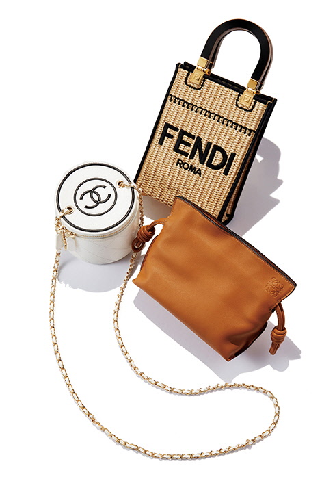 내추럴 스트로 소재로 제작한 펜디 선샤인 쇼퍼 미니 백. 13X18cm, 1백만원대 펜디. 문의 02-514-0652. 송아지가죽으로 제작한 플라멩코 클러치 나노 백. 12.5X15.5cm, 가격 미정 로에베. 문의 02-6905-3470. 화이트 램 스킨 클러치 백. 9X10cm, 가격 미정 샤넬.문의 080-200-2700, chanel.com