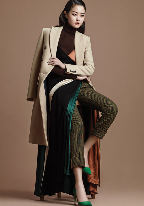 베이지 캐시미어 더블 코트 3백30만원 폴 스미스. 멀티컬러 블록 실크 슬립 드레스 9백40만원 페라가모. 체크 팬츠 가격미정 디스퀘어드2. 그린 컬러 펌프스 94만원 지미추.