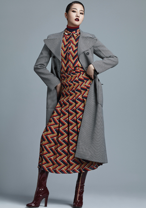 블랙 & 화이트 체크 패턴 코트 5백만원 대, 이너로 착용한 네이비 터틀넥 톱 1백만원 대 모두 루이 비통. 빈티지 무드의 패턴 셔츠 1백82만원, 스커트 1백33만5천원 모두 구찌. 버건디 페이턴트 부츠 가격미정 발렌티노. 스와로브스키 디테일의 골드 네크리스 38만원 미네타니.