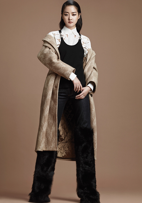 플라워 레이스 디테일의 캐시미어 코트 7백18만원 막스마라. 레이스 펀칭을 더한 화이트 셔츠, 블랙 니트 베스트 모두 가격미정 셀린느. 블랙 시어링 퍼 데님 팬츠 가격미정 펜디.