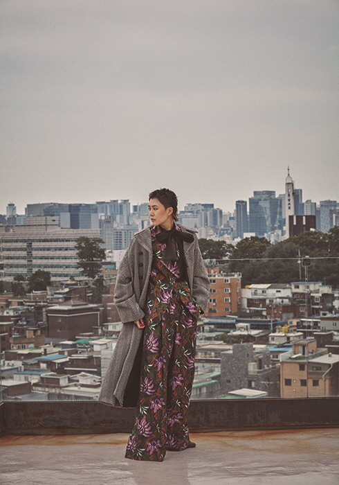 그레이 헤링본 코트 3백37만원, 블랙 리본 셔츠 가격 미정 모두 엠포리오 아르마니. 플라워 프린트 재킷, 팬츠 모두 가격 미정 드리스 반 노튼. 블랙 부츠 2백26만원 발렌티노 가라바니.
