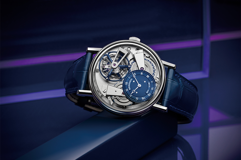 트래디션 퓨제 투르비용 7047 창립자 아브라함-루이 브레게의 가장 큰 유산 중 하나인 투르비용의 발명을 기리는 모델. 18세기 남성들이 재킷이나 베스트 등에 소지하고 다니던 포켓 워치는 수직 상태에서 정확성이 떨어지는 문제가 있었다. 이로 인한 오차를 극복하고자 아브라함-루이 브레게는 1801년 최초의 투르비용을 고안해 이에 대한 특허를 출원하며 또 한번 놀라운 업적을 이뤄냈다. 새로운 투르비용 7047 모델에 장착한 퓨제 체인 투르비용의 트랜스미션 메커니즘은 와인딩 수준에 관계없이 일정한 토크(torque, 회전력)를 보장해 시계의 규칙적인 작동을 가능케 하는 특성을 지닌다. 배럴이 완전히 와인딩되면 최대한의 동력이 발휘되는데 체인은 퓨제 상단, 즉 가장 작은 둘레를 따라 움직인다. 체인이 풀리면서 토크는 감소하지만 퓨제의 가장 넓은 부분인 베이스와 나란히 움직이며 전달되는 동력은 일정하게 유지된다. 브랜드의 상징적 코드를 녹여낸 현대적인 디자인의 새로운 투르비용 7047은 기요셰로 클루 드 파리 패턴을 표현한 오프센터 골드 다이얼, 전통적인 로마숫자 인덱스, 사과 형태의 핸즈를 통해 하우스의 유산을 재현했다. 브레게는 시각적으로 통일된 느낌을 주기 위해 부품 전체에 다양한 처리 기법을 사용했는데, 티타늄 소재의 투르비용 케이지와 다이얼은 블루 코팅을, 체인 링크는 푸른빛의 열 처리 과정을 거쳤다. 지름 41mm, 두께 16mm의 플래티넘 케이스 중심에서 힘차게 박동하는 인하우스 수동 칼리버 569는 총 5백42개의 부품으로 구성되었으며, 역선으로 배치한 레버 이스케이프먼트, 실리콘 러그 및 밸런스 스프링을 장착해 자기장의 영향에서 자유롭고 부식과 마모에 강하다. 시간당 1만8천8백 회 진동하며 50시간의 파워 리저브 기능을 갖췄다. 플래티넘 소재의 트리플 블레이드 폴딩 버클을 장착한 미드나잇 블루 컬러 앨리게이터 스트랩과 함께 제공한다.