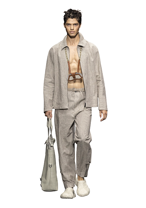 (오른쪽) No more shirts_EMPORIO ARMANI 재킷, 드레스 셔츠, 넥타이가 한 세트라는 고정관념은 버릴 것! 무심하게 툭 걸친 재킷이 당신을 더욱 쿨하게 연출해준다. 최근 레드 카펫에 재킷만 걸치고 등장한 티모시 샬라메의 센스 있는 스타일링처럼 말이다. 아미 쇼에서는 셔츠를 입지 않고 넉넉한 핏의 화이트 수트와 스니커즈, 그리고 포인트 컬러 역할을 하는 스카프를 매칭해 감각적인 모습을 연출했고, 폴 스미스 쇼에서는 그러데이션된 뉴트럴 컬러를 가미한 수트에 샌들을 매칭해 시원한 느낌을 줄 수 있도록 했다. 런웨이가 아닌 일상생활에서는 재킷 단추를 하나만 잠근다면 무리 없이 소화할 수 있을 것.