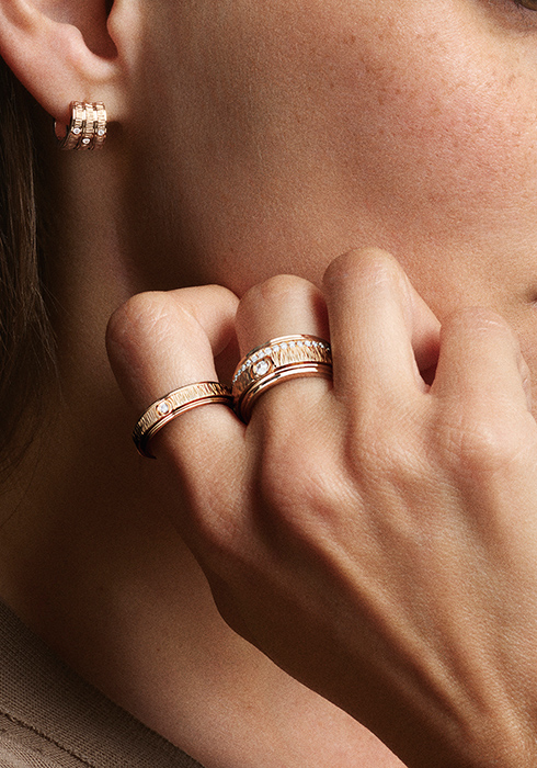 피아제를 대표하는 포제션 컬렉션은 링 중앙에 포개진 또 다른 밴드가 회전하는 특유의 경쾌한 디자인이 특징이다. 착용자의 움직임에 따라 끝없이 계속되는 터닝은 그 자체만으로 장식적인 효과를 발휘할 뿐 아니라 행운을 불러오는 부적과 같은 의미를 지녔다. 펜던트, 네크리스, 뱅글, 브레이슬릿 등으로 라인업을 확장하며 다채로운 재해석을 보여온 포제션 컬렉션이 올해 더욱 새롭고 획기적인 모습으로 등장했다. 메종의 눈부신 금세공 기술을 대변하는 팰리스 데코 장식을 접목한 것. 다양한 사이즈로 선보이는 화이트 골드 또는 핑크 골드 소재의 링, 핑크 골드 소재의 트리플 이어링은 모두 1개나 2개의 회전 밴드를 갖추고, 일부 또는 전체에 팰리스 데코 인그레이빙을 더했다. 또 다이아몬드 주변에 2개의 골드 반구를 배치해 스톤의 광채를 극대화하는 피아제 고유의 포제션 세팅(하프 문 세팅)을 적용해 더욱 특별하다. 심플한 것부터 화려하고 볼드한 모델에 이르기까지 다양한 디자인으로 출시해 선택의 폭이 넓을 뿐 아니라, 여러 제품을 레이어링하거나 믹스 매치하기에 용이해 개성 있는 스타일을 연출할 수 있다. 지금, 일상에 마법 같은 순간들을 가져다줄 피아제 포제션 팰리스 데코 컬렉션을 만나보자. 문의 1688-1874