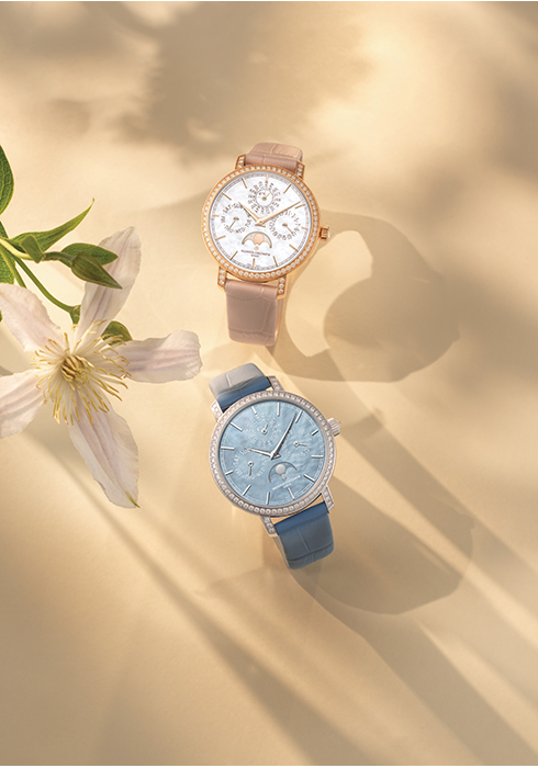 (위부터) 지름 36.5mm 18K 5N 핑크 골드 케이스에 화이트 머더오브펄 다이얼을 매치했으며 로즈 베이지 컬러의 앨리게이터 레더 스트랩을 더해 우아함과 여성스러움이 돋보이는 워치, 블루 그레이 머더오브펄 다이얼로 신비감을 더하고 18K 화이트 골드 케이스와 베젤, 러그에 세팅한 화이트 다이아몬드로 시원한 느낌을 주는 워치 각 1억1천6백만원대 바쉐론 콘스탄틴. 문의 1877-4306