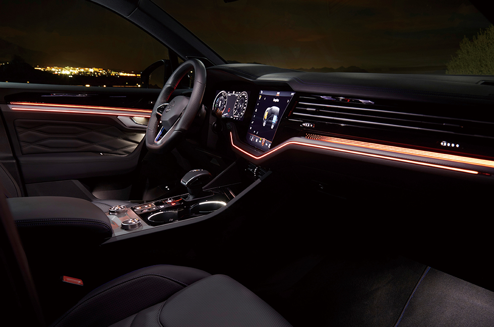 이 외에도 고휘도의 12.3인치 디스플레이 전체에 내비게이션 맵을 띄우거나 첨단 운전자 보조 시스템을 3D로 표현하는 등 기존에 볼 수 없었던 폭스바겐의 혁신을 보여준다. 그뿐만 아니라 윈드 실드 타입의 헤드업 디스플레이까지 갖춰 운전 집중도는 더욱 올라간다. 인테리어 디자이너로 입사했던 클라우스 지시오라는 채광성, 거주성, 적재성을 통해 투아렉 인테리어에 고급 리빙룸에서 누릴 수 있는 안락함을 집어넣었다. 신형 투아렉은 바깥에서 들여다보는 것보다 안에서 내다볼 때 밖이 훤히 더 잘 보인다. 시트 포지션을 높게 설계한 이유도 있지만 그린 하우스를 넓게 빼고 머리 위에 파노라마 선루프를 널찍하게 뚫은 점도 노력의 하나다. 볕이 잘 들지 않는 집은 오래 있고 싶지 않은 것처럼 그는 차를 그릴 때 어떻게 하면 빛을 더 많이 들일까 고민했다. 자연광은 아니지만 신형 투아렉에는 인공광도 상당 부분 들어갔다. 대시보드를 비롯해 도어 패널에 이르기까지 실내 전체를 감싸는 앰비언트 라이트는 리빙룸에서 볼 수 있는 고급 무드등 느낌을 연출한다. 소재 부분에서도 신형 투아렉은 한 걸음 더 나아갔다. 부드러운 우레탄 소재의 적용 범위를 넓혔고 스티어링 휠은 질 좋은 가죽으로 꼼꼼하게 감쌌다.
