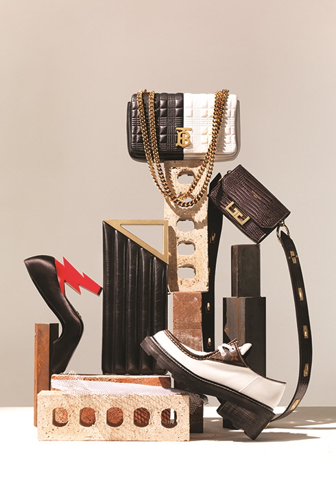(위부터 시계 방향으로) 기하학적 퀼팅 디테일, 유광 체인 스트랩, 볼드한 모노그램 장식이 특징인 양가죽 소재 투톤 롤라 백 2백19만원 버버리. 크로커다일 패턴을 엠보싱 처리한 카프 스킨 소재의 나노 사이즈 에덴 백. 메탈 트위스트 잠금장치를 장식적 요소로 활용한 두꺼운 숄더 스트랩이 멋스럽다. 3백13만원 지방시. 화이트 컬러의 LV 보부르 플랫폼 더비 슈즈 1백40만원대 루이 비통. 세로로 패딩 처리한 카프 스킨과 각진 메탈 소재 핸들의 조화가 멋스러운 클러치 1백88만원 보테가 베네타. 강렬한 레드 컬러의 ‘썬더’ 힐을 더한 새틴 펌프스 1백10만원 프라다.