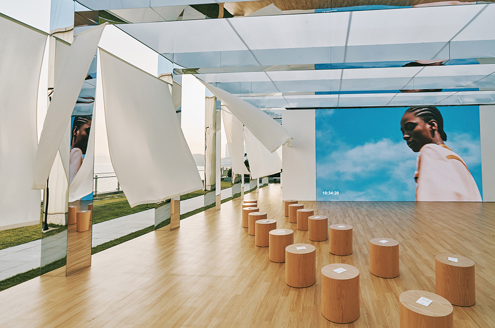 “플로라는 본능적으로 에르메스의 방식과 수작업, 공예의 중요성을 이해했다”는 나데주의 말처럼 플로라가 르 부르제 공항을 바람과 빛을 연상시키는 작업으로 재탄생시킨 공간에서 에르메스의 뉴 컬렉션은 더없이 완벽하고 감동적이었다.팀이 원한 컬렉션의 느낌은 그녀들의 표현에 따르면 ‘태양의 키스를 받은 여성이 세상에 나아가는 것’. 태닝한 피붓빛 같은 내추럴 브라운, 맑은 공기와 바람을 떠올리게 하는 화이트, 땅과 흙의 컬러인 블랙과 카키 그레이 등 에르메스가 사랑하는 컬러들이 파노라마 페인팅과 자연스럽게 어우러지며 또 한 번 레전드 컬렉션을 완성했다. 패브릭보다 더 부드럽게 물결치는 가죽과 이국적인 매력의 아플리케 디테일, 크리스피한 소재와 가죽의 영리한 믹스 매치 등은 내년 시즌에 선보일 에르메스 컬렉션에 대한 기대감을 더욱 높이게 했다. 이번 쇼는 팬데믹 시대를 고려해 전 세계에 생중계되었으며, 지평선과 해안이 있는, 탁 트인 공간을 갖춘 도시(부산, 일본 가나가와, 뉴욕, 런던, 아부다비)에서는 각기 다른 시노그래피와 함께 대형 스크린을 통해 생중계되어 쇼 분위기를 함께 느낄 수 있는 특별한 경험을 선사했다. 파리의 런웨이를 실시간으로 재현한 듯한 세트와 공간에서 대형 스크린을 통해 바로 만날 수 있었던 쇼의 현장감은 해운대 밤바다의 청량한 기운과 어울려 잊을 수 없는 추억으로 남을 듯하다.