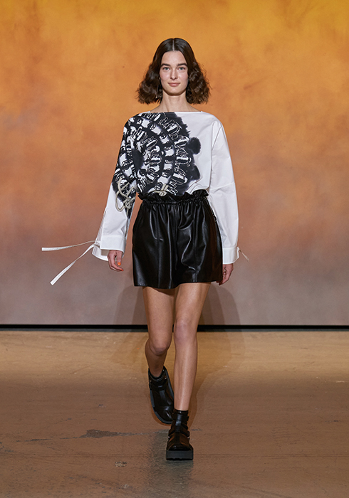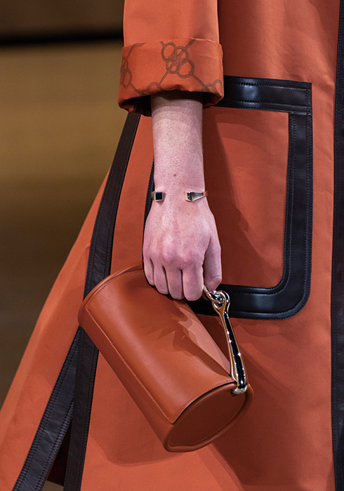 에르메스 여성복을 성공적으로 이끌고 있는 나데주 바니-시뷸스키(Nade`ge Vanhe´e-Cybulski)는 이번 시즌 컬렉션을 아티스트 플로라 모스코비치(Flora Moscovici)와 함께했다. 파리의 공공장소를 특유의 컬러감으로 재탄생시키는 그녀의 작업을 에르메스와 연결한 나데주의 선택은 너무도 탁월했다. 새로운 방식과 경험의 패션쇼를 원했던 에르메스와 나데주의 의도가 그녀의 작품을 접한 순간 완벽하게 맞아떨어졌다고 할까. “나는 빛이 가득 찬, 태양 같은, 페인팅을 통한 강력한 접근을 원했다.” 나데주는 플로라와의 대담에서 이렇게 밝혔다. 패션쇼는 파리 근교에 있는 르 부르제 공항에서 열렸는데 기념비적이면서도 개방된 공간감을 원했던 나데주가 늘 꿈꿔오던 공간이었다. 플로라는 이 공간을 활용해 20개 가까운 파노라마 대형 페인팅(높이 6m, 너비 9m 혹은 7m)을 제작했으며, 이 작품들은 미끄러지고 때론 겹쳐지고 앞으로 움직이면서 생명감과 생동감을 불어넣었다. 패브릭 위에 회화적으로 재현한 컬러 페인팅은 햇살처럼, 혹은 땅의 기운처럼 새로운 생태계를 창조해냈다. 자연과 건축, 회화와 설치 작품, 그리고 패션과 공간이 플로라의 작품 안에서 하나가 된 것이다.