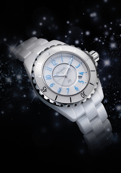 여자들의 로망인 샤넬의 화이트 세라믹 워치. 가장 기본형인 순백의 세라믹에 독특하게 파스텔 블루 컬러의 야광 인덱스 다이얼을 매치한 여성스러운 디자인의 한정판 J12. 6백만원대.