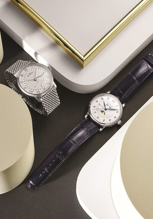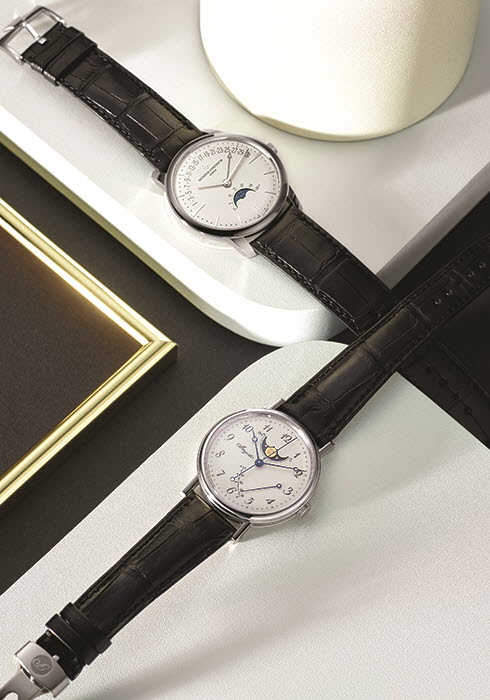 바쉐론 콘스탄틴 페트리모니 문페이즈 앤드 레트로그레이드 데이트 바쉐론 콘스탄틴의 시계 중 가장 클래식하다고 해도 과언이 아닌 페트리모니 컬렉션에 문페이즈와 레트로그레이드 기능의 데이트 디스플레이를 적용한 모델. 시계 애호가들 사이에서 로망으로 손꼽힌다. 전형적인 순수한 라인이 돋보이는 화이트 골드 케이스가 우아하고, 레트로그레이드를 갖춘 날짜 디스플레이와 더불어 1백22년 동안 별도의 조정 없이 작동 가능한 문페이즈는 달이 지구 둘레를 일주하는 실제 음력 사이클을 기반으로 했을 정도로 극도의 정밀함을 보여준다. 5천만원대.
