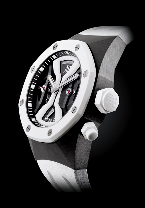 브랜드의 시그너처인 로열 오크가 화이트 세라믹과 화이트 러버 소재를 장착하고 완전히 새로워졌다. 다이얼 정중앙에 모래시계를 연상케 하는 형상의 티타늄 소재 구조물과 화이트 세라믹, 러버 소재를 매치해 시선을 압도한다. 3시 방향에는 GMT를 표기하는 세컨드 창이 있고, 9시 방향에서는 0.45g에 불과한 투르비용 캐리지의 섬세한 움직임을 확인할 수 있다. 팔각형 다이얼 형태가 화이트 컬러를 입은 것만으로도 로열 오크 마니아들에게는 일대 혁신이다. 세라믹은 스틸보다 강도가 9배 이상 높고 다이아몬드를 제외한 거의 모든 다른 소재보다 강하기 때문에 스크래치가 날 위험이 낮다. 초경량 알루미늄과 강도 높은 티타늄, 하이테크 메탈까지 소재에 대한 오데마 피게의 다양한 시도와 오랜 노하우가 돋보이는 제품이기도 하다. 핸드와인딩 매뉴팩처 칼리버 2930을 장착했다.
