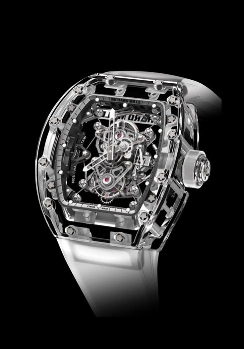 실제로 홍콩 전시장에서 가장 눈길을 사로잡은 제품이다. 브랜드를 대표하는 토너 형태에 완벽하게 투명한 사파이어 케이스 워치는 심지어 포토제닉하기까지 하다. 3년 전 출시된 RM56 사파이어 투르비용 스플릿 크로노그래프 이후로 이 이상의 완성도는 어렵다는 이야기까지 나왔다. 올해 워치스 앤드 원더스를 위해 제작한 모델로, 투명한 사파이어 부품과 케이블을 장착한 무브먼트를 통해 초정밀 시계의 세계에서 가벼운 무게와 투명성이라는 숙제를 모두 해결했다. 어려운 소재에 대한 도전을 멈추지 않는 리차드 밀은 사파이어 소재의 와인딩 배럴 브리지와 투르비용 브리지를 새롭게 디자인했고, 케이스 역시 견고한 사파이어를 가공해 완성했다. 케이스 하나를 제작하기 위해 40일, 무브먼트 공정과 마무리 작업에 4백 시간 이상이 소요되는 진정한 하이테크 워치다. 10개 한정 생산한다.