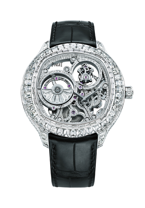 워치메이킹과 주얼리 세팅 분야에서 모두 탁월한 성취를 이룬 피아제의 모든 기술력이 총집결한 드라마틱한 컬렉션. 피아제 자체 제작 울트라 신 무브먼트인 칼리버 1270D를 장착했는데, 플래티넘 소재의 마이크로 로터와 완벽하게 균형 잡힌 밸런스 브리지가 돋보인다. 빈틈없이 촘촘하게 이어진 다이아몬드 세팅 역시 피아제의 기술력이 잘 드러나는 부분. 6백50개의 브릴리언트 컷 다이아몬드 4.4캐럿, 44개의 바게트 컷 다이아몬드 7.7캐럿, 92개의 에메랄드 컷 다이아몬드 2.9캐럿, 8개의 바게트 컷 다이아몬드 0.2캐럿이 워치 케이스를 완벽하게 감싸 역시 피아제라는 감탄을 자아내게 한다.