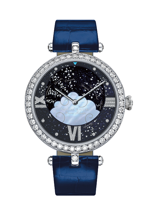 올해 워치스 앤드 원더스를 위한 신제품인, 아름다운 유성에서 영감을 받은 포에틱 컴플리케이션 타임피스. 유성이 떨어지는 아름다운 현상을 시계에 담은 반클리프 아펠의 새로운 워치는 1년에 12개의 유성이 떨어지도록 고안한 다이얼로 여성스러움을 극대화했다. 유성을 표현한 다이얼은 정확히 1년에 한 바퀴 회전하며 뒷면의 캘린더에 날짜를 입력하면 해당 연도에 시간당 떨어지는 유성의 평균 개수를 곡선을 통해 알려준다. 단순히 시간을 알려주는 것을 넘어 자신만의 시간을 소유하고 의미를 담을 수 있는 특별한 워치를 추구하는 반클리프 아펠만의 매력을 담은 워치다. 워치 가운데 머더오브펄로 표현한 구름 형태도 사랑스럽다.