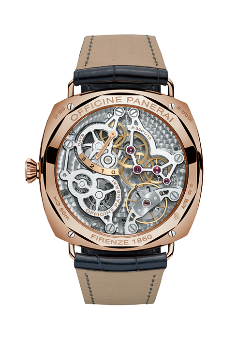 다이얼은 단순하지만 백 케이스에서 정교함을 눈으로 확인할 수 있는 파네라이 특유의 매력을 담은 스페셜 에디션. 지금까지 선보인 단순한 디자인에 아주 작은 변화만을 더했지만, 진한 블루 다이얼과 레드 골드 케이스의 절묘한 조화는 파네라이의 마니아인 파네리스트의 눈길을 사로잡았다. 군더더기 없이 단순한 브랜드 고유의 매력은 그대로 유지하고 컬러와 몇 가지 시간 표시 요소를 더해 클래식한 매력이 느껴진다. 자체 제작 무브먼트인 P.3001/10 칼리버는 두 가지 시간을 표시할 수 있는 GMT 기능과 3일간의 파워 리저브 기능을 갖췄다. 단 2백 개만 제작한 특별 에디션으로, 파네라이 고유의 매력에 특별한 컬러를 입혀 소장 가치를 높였다.
