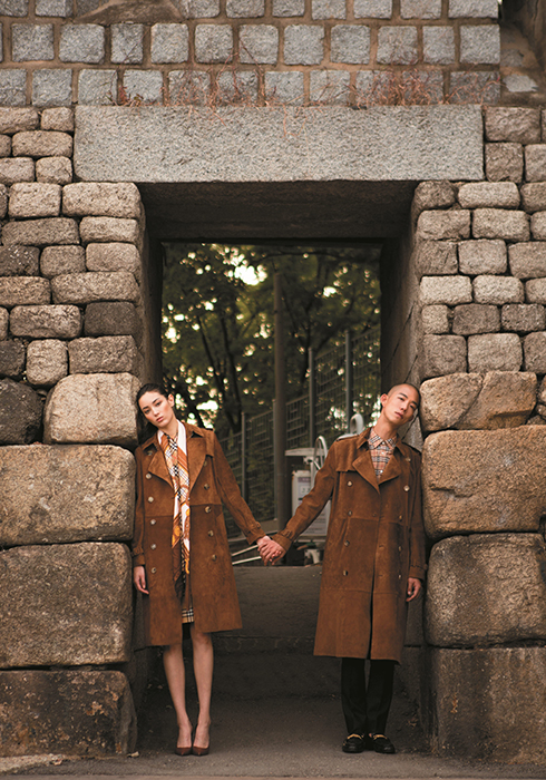 (남자) 스웨이드 코트, 빈티지 체크 셔츠, 울 테일러드 팬츠, 링크 장식의 가죽 로퍼 모두 버버리.