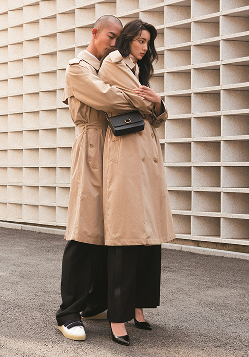 (여자) 허니 색상의 트렌치코트, 블랙 와이드 팬츠, 실크 소재의 아카이브 프린트 롱 스카프, 골드 체인 스트랩을 더한 미니 디-링 백, 레더 스틸레토 힐 모두 버버리.
