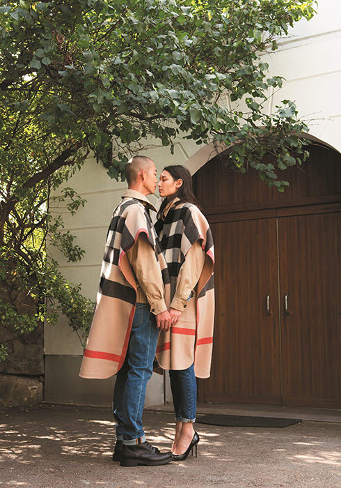(남자) 리버서블 빈티지 체크 울 판초, 허니 색상의 해링턴 재킷, 스트레이트 핏 데님 팬츠, 브로그 디테일 레더 부츠 모두 버버리.(여자) 빈티지 체크 울 판초, 리버서블 해링턴 재킷, 스트레이트 핏 데님 팬츠, 블랙 스틸레토 힐 모두 버버리.