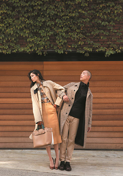 (남자) 안쪽에 탈착 가능한 패딩 베스트를 더한 체크 카 코트, 코튼 슬림 핏 팬츠, 레더 브로그 슈즈 모두 버버리.