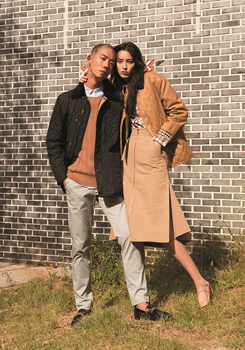 (남자) 코듀로이 칼라 디테일이 돋보이는 퀼티드 재킷, 옥스퍼드 셔츠, 캐멀 색상의 케이블 니트, 코튼 팬츠, 링크 장식의 가죽 로퍼 모두 버버리.