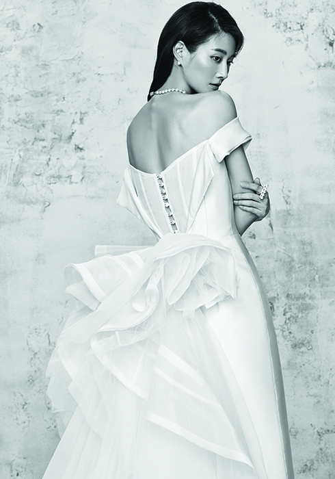 드레스 가격 미정 이명순 웨딩드레스. 화려한 분위기를 자아내는 클래식한 남양 진주 이어링과 남양 진주 비드 네크리스 모두 가격 미정, 진주를 일렬로 배열한 18K 화이트 골드 바에 최상급 멜레 다이아몬드를 세팅한 밸런스 파베 링 1천7백만원대 모두 타사키. |