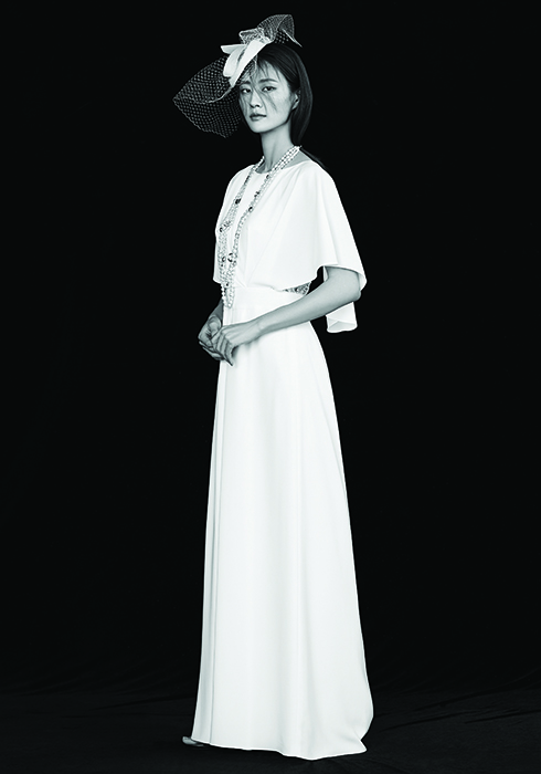 케이프 스타일의 톱과 와이드 팬츠가 모던한 점프 수트 스타일의 드레스 2백만원대 르메르 by 노비아. 메시 소재의 베일을 매치한 웨딩 햇 가격 미정 앙뜨. 진주와 메탈 소재의 커스텀 주얼리 네크리스 가격 미정 샤넬. |