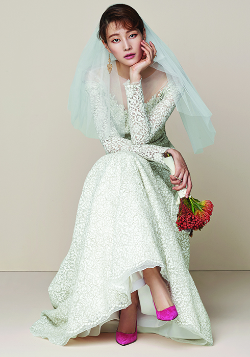 레이스 소재의 머메이드 라인 드레스 가격 미정 시작 by 이명순. 앤티크한 골드 드롭 이어링 9만5천원 제이미앤벨. 거미줄 모티브의 골드 컬러 실버 링 22만원 코디시아르. 세공한 크리스털을 매치한 골드 더블 링 28만원 타니 by 미네타니. 핫핑크 컬러의 스웨이드 스틸레토 힐 70만원대 살바토레 페라가모. |