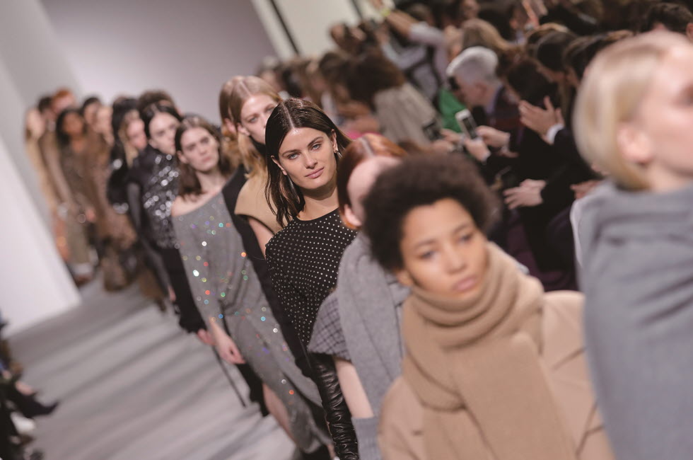 마이클코어스의 2017 가을 패션쇼가 열린 뉴욕 스프링 스튜디오에서는 기존 컬렉션과 달리 남성복 컬렉션을 함께 소개해 눈길을 끌었다. 웅장한 오케스트라의 공연과 함께 시작된 무대는 남성복에서 영감을 받은 디자인과 여성스러운 실루엣의 완벽한 하모니로 채워졌다. 그렇다고 남성복과 여성복의 식상한 트위스트를 말하는 게 아니다. 어깨와 허리 라인을 강조한 클래식한 디자인이 주를 이루며, 체크 패턴의 오버사이즈 코트에 슬릿 디테일 스커트를 매치하거나, 매니시한 코트와 팬츠에 여성스러운 실크 블라우스를 더하는 등 상반된 매력의 조화를 이뤄낸 것. 남성복에서 차용한 아이디어가 오히려 우아하고 고급스러운 관능미를 한층 강조한 셈이다. 마이클코어스의 대표적인 컬러라 할 수 있는 고급스러운 캐멀 색상을 필두로, 차분한 그레이와 시크한 블랙 컬러를 메인 팔레트로 사용했으며, 크림색과 짙은 올리브, 버건디 컬러를 새롭게 포인트 컬러로 추가해 고급스러우면서도 세련된 무드를 이끌어냈다. 특히 그중에서도 메탈릭 실크와 레오퍼드 프린트, 또는 크리스털로 정교하게 장식한 드레스 등은 글래머러스한 여배우를 상기시킬 만큼 독보적인 매력을 발휘했다. 평소 마이클코어스 팬이라 자처하는 할리우드 스타 블레이크 라이블리와 어맨다 피트부터 세계적인 여배우들이 쇼장을 찾은 가운데, 한국 대표로 배우 민효린과 모델 아이린이 참석해 많은 이들의 이목을 집중시켰다. 이 모든 상황은 유튜브와 페이스북 라이브, 트위터를 통해 생중계되어 런웨이의 현장감을 전 세계 곳곳에 생생하게 전달하기도.
