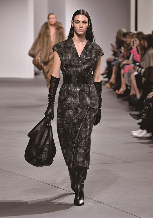 12 남성적인 느낌을 자아내는, 어깨를 강조한 룩에 여성스러운 실루엣이 드러나도록 허리를 잘록하게 연출한 마이클코어스 컬렉션.