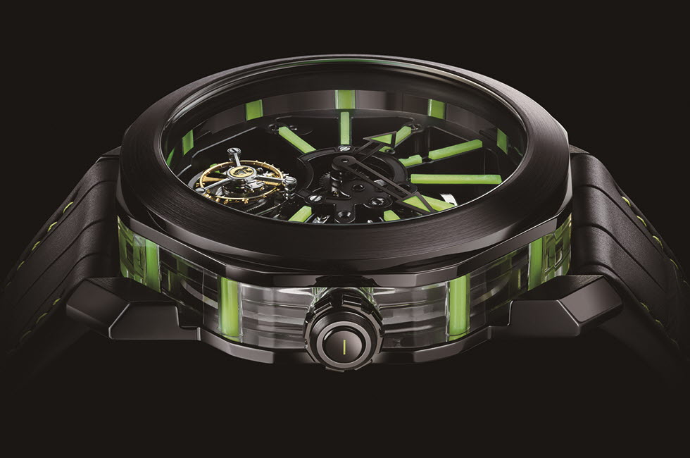 3 측면에서 보았을 때 사파이어의 투명함이 더욱 돋보이는 티타늄 소재의 ‘옥토 뚜르비용 사파이어’.