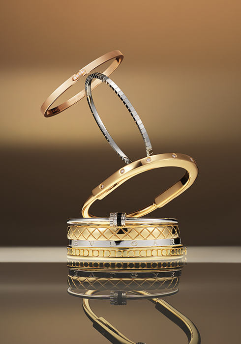 옐로 골드 소재로 직사각형과 동그라미가 교차로 이어진 디자인이 역동적인 매력을 발산한다. 가격 미정. 문의 02-515-1924