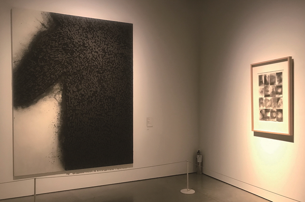 그 자체로 기호이자 소통의 매개체인 ‘글(writings)’을 다룬 섹션은 또 어떠한가. “언어라 함은 의도를 내포함을 뜻한다”며, “일찍부터 이미지를 나타내는 그림을 그려왔고 한번도 그것을 언어라고 생각하지 않았다”는 피에르 술라주의 작품을 이 섹션에 걸어둔 것은 큐레이터의 의도였을까. 앤 매든의 ‘And the word was god’(1979)에서처럼 미술은 이 세계를 구성하는 요소를 이해하도록 돕는 글자 그대로에 띄어쓰기를 없애거나 형태에 약간의 변주를 주어 개념을 담기도 한다. 이는 신문지에 펜, 볼펜, 연필을 이용해 전면을 흑색으로 칠하는 인내의 작업 ‘무제’(2009)로 애초에 글씨가 있었는지조차 모를 정도로 의미를 철저히 지워내고 암흑 속 침묵만 남기는 최병소의 작업과 사뭇 대조된다.
