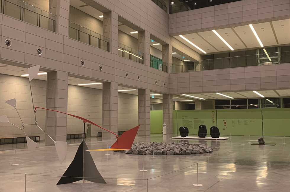 전시의 처음이자 마지막인 ‘기원’에 이르기 전 펼쳐지는 ‘재신비화된 세상’ 공간에서 3개의 노란 태양을 형상화한 칼더의 모빌과 서커스를 방불케 하는 청동 조각 너머로, ‘예술에 대한 나의 전체적인 이론은 형태, 대중, 움직임 사이에 존재하는 불일치’라던 칼더의 말을 되새겨본다. 매그 재단의 국보급 작품 샤갈의 ‘삶(La Vie)’(1979) 속 파편들이 한데 빚어내는 희로애락을 들여다보면서 “마음으로 창조하면 거의 모든 의도가 남는다. 머리로 창조한다면 거의 아무것도 아닌 게 된다”라던 작가의 의도를 진실로 들여다보고 싶어진다. 비로소 ‘기원’을 다룬 미술관 1층에 자리 잡은 어미홀에 다다르면 리차드 롱과 이우환이 각각 작업의 재료이자 원천으로 삼은, ‘지구보다 더 오래된 시간의 덩어리(이우환)’인 돌 앞을 배회하고, 불에 완전히 전소된 나무의 잔재지만 새로운 에너지의 탄생이 근원이 되는 숯의 생성과 소멸의 무한한 교차를 담은 이배 작가 작품을 가만히 응시하다 보면 결국 예술은 동서양을 뛰어넘어 자연과 조화를 이루는 인간의 흔적을 이해해나가는 여행이라고 절로 수긍하게 된다. 오는 3월 27일까지. http://artmuseum.daegu.go.kr